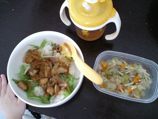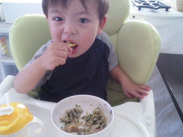 こんな感じなので、離乳食もおひざの上で。